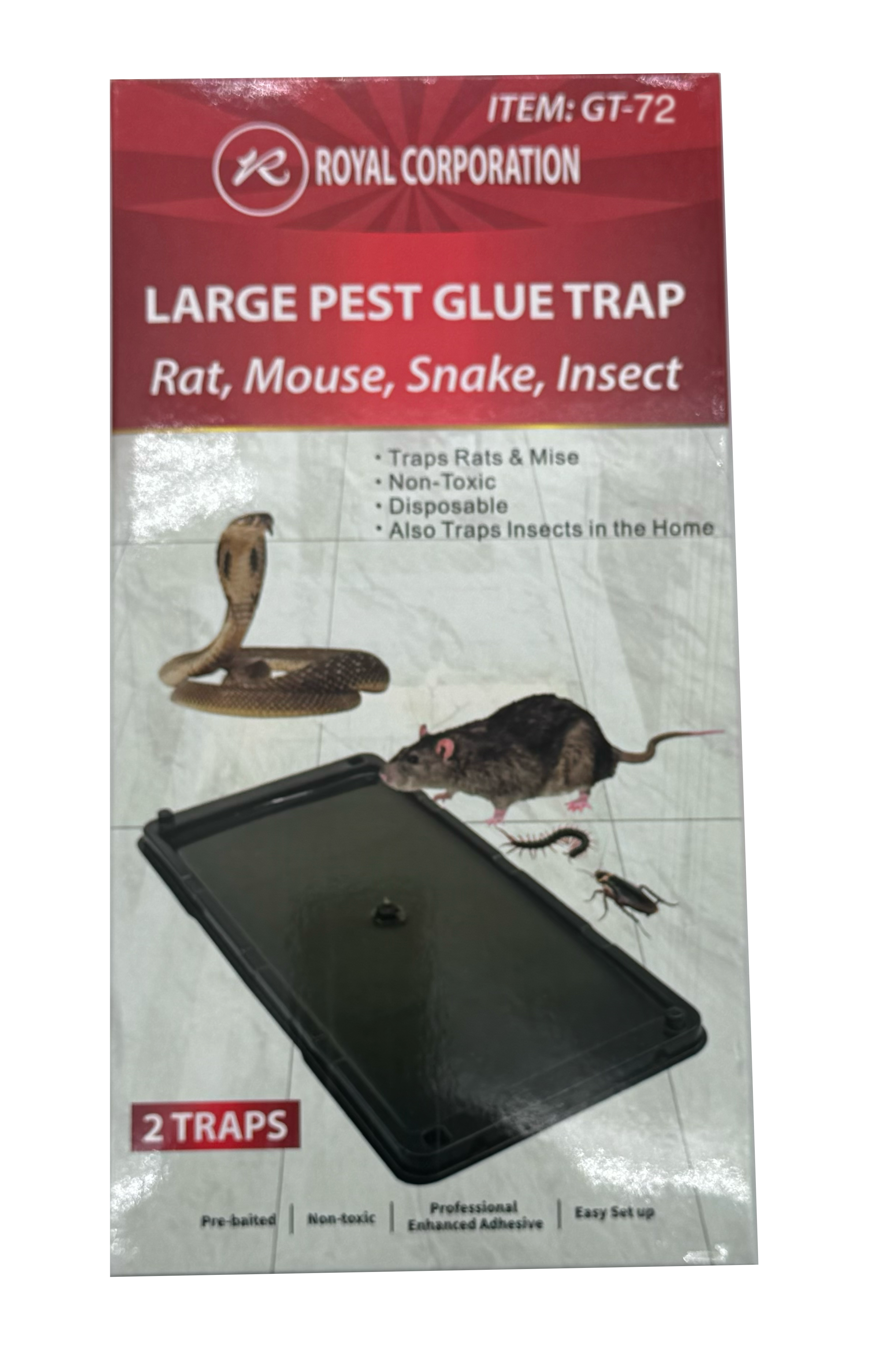 The Royal Large Pest Glue Traps are ideal for handling larger pests like rats. Each case includes 72 oversized disposable glue traps, with 2 traps packed per box for easy handling.