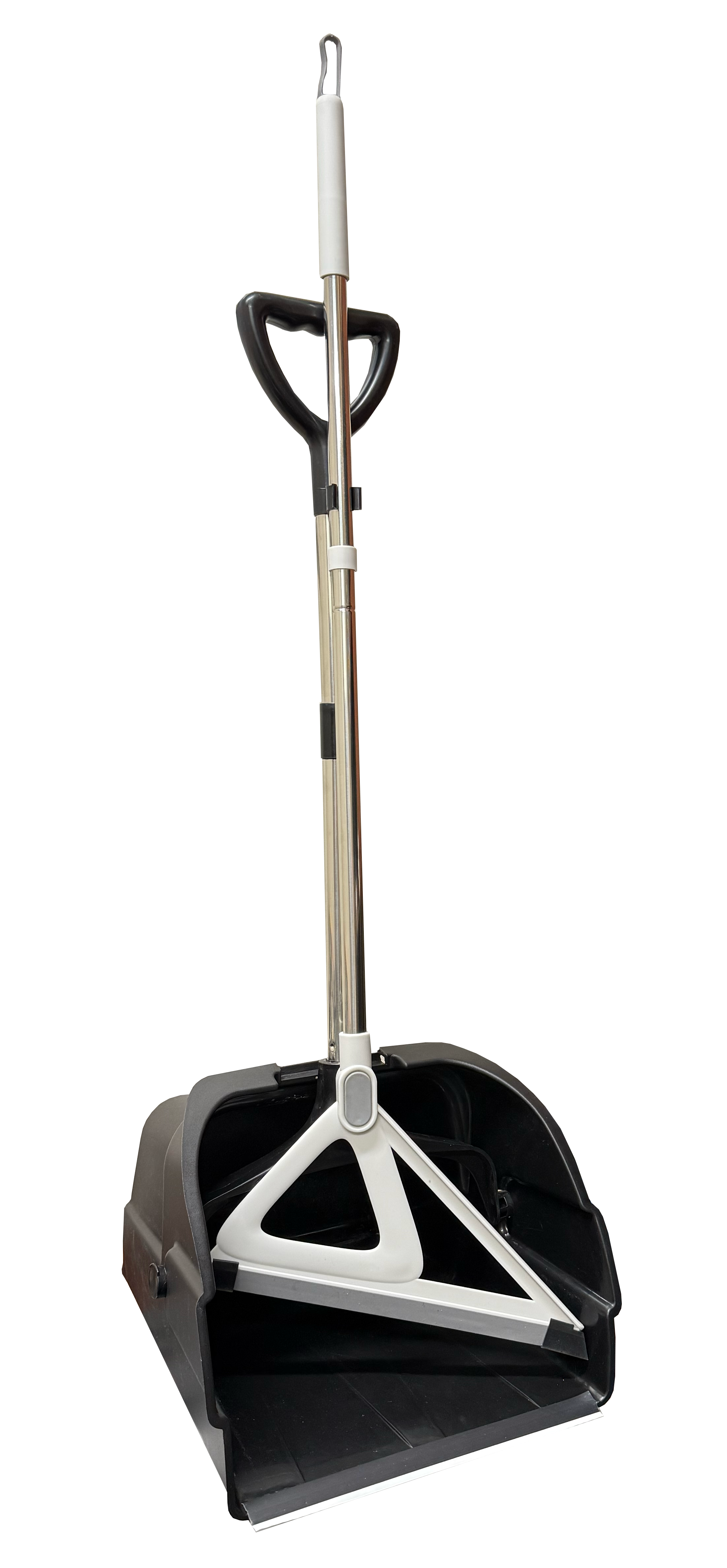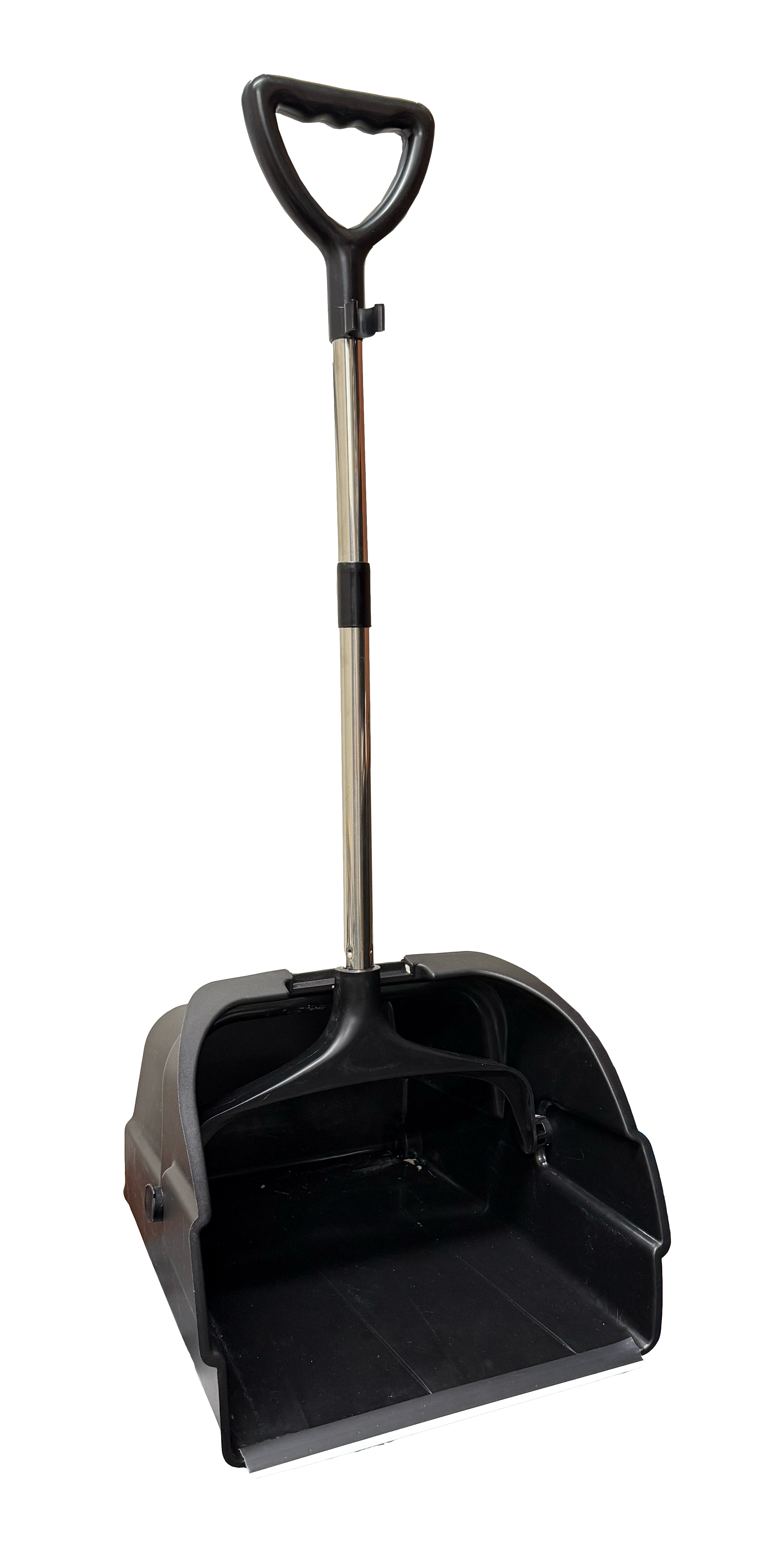 The new lobby dustpan features an ergonomic handle and integrated broom holder. Its durable, lightweight design includes a large debris collection container, making cleaning easier and more efficient.