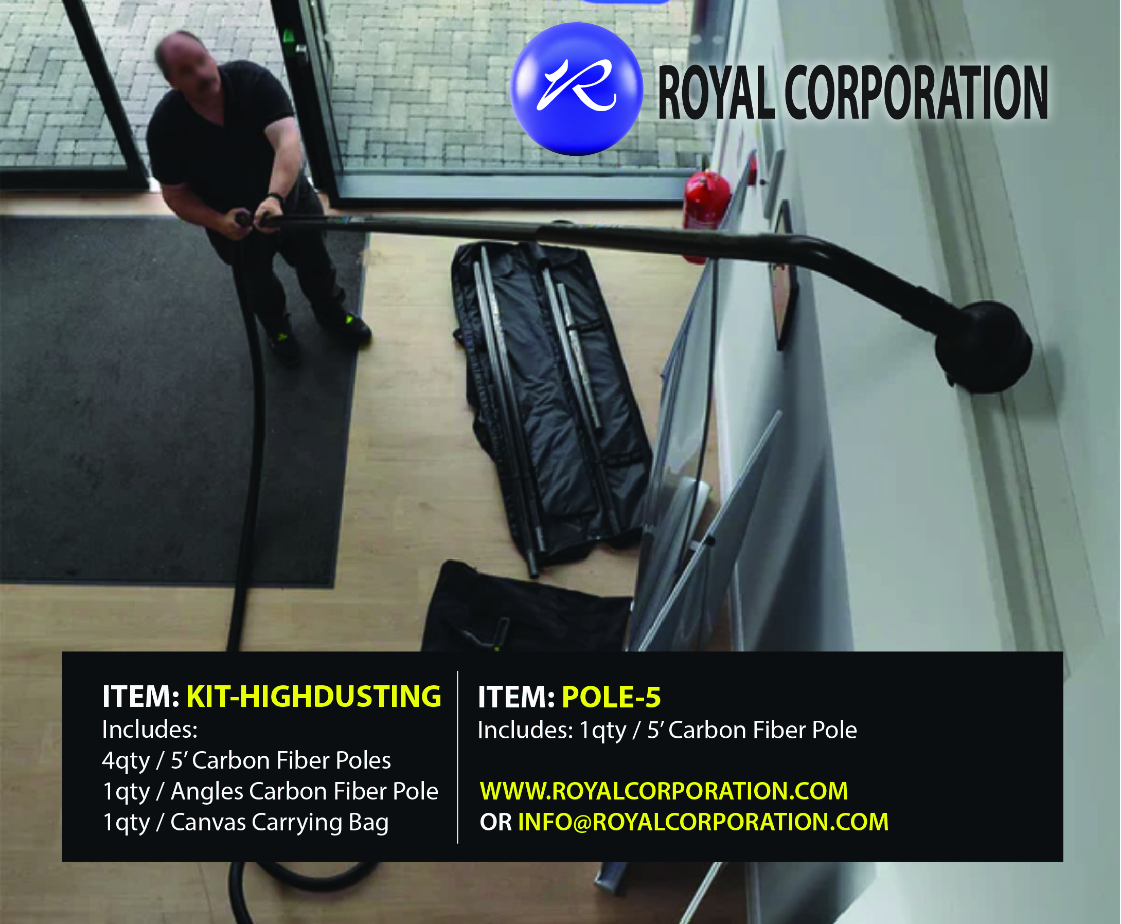 The Royal Highdusting Kit is made of very lightweight and sturdy carbon fiber material. The kit comes with 20′ of carbon fiber poles and additional 5′ poles may be added separately to increase the reach.